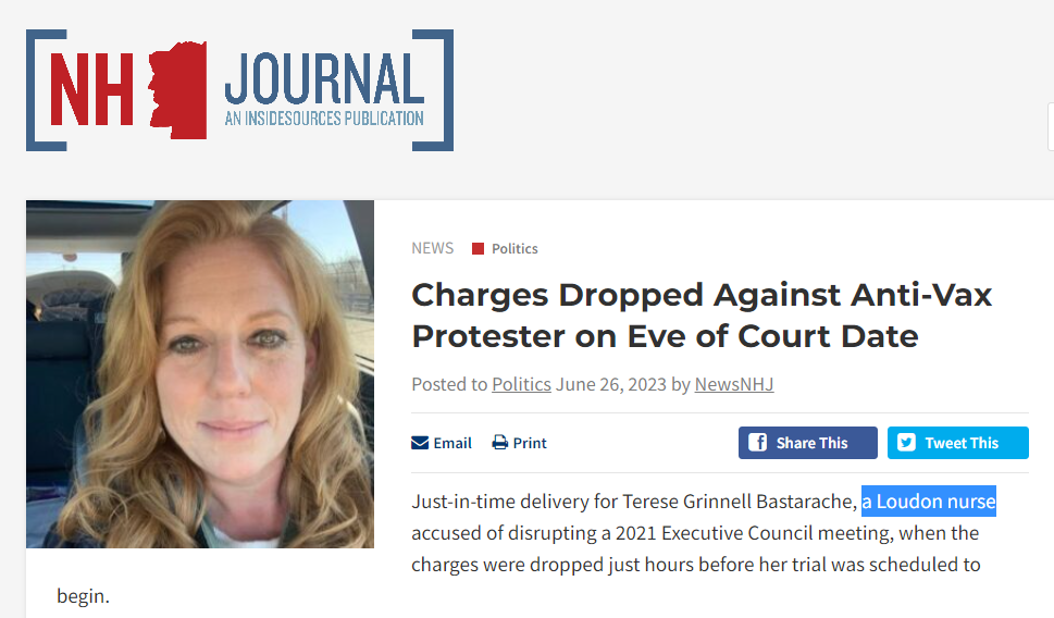 New Hampshire Journal has an article on Grinnell’s charges being dropped. The headline is “Charges Dropped Against Anti-Vax Protester on Eve of Court Date.”