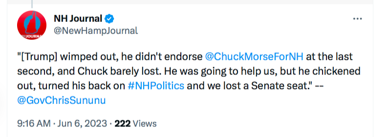 According to Sun-King Sununu, Trump is a LOSER. Indeed, His Majesty has called him a three-time LOSER … 2018, 2020 and 2022. Yet His Majesty is simultaneously telling us that the lack of a Trump endorsement … you know that same three-time LOSER Trump … is the reason Chuck Morse lost, more like got his Establishment ass kicked, by Don Bolduc.