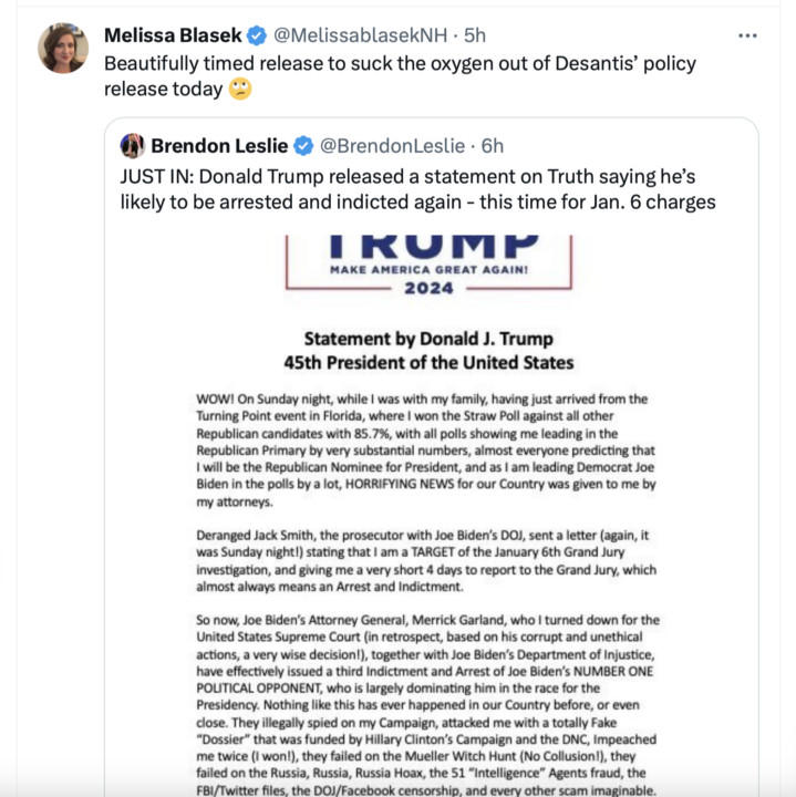 Here’s the tweet. Blasek is outraged … OUTRAGED … not that Trump will soon be a political prisoner (he has no chance in DC – the judges are total political hacks, and the jury pool are Democrats who believe that Republicans are Hitler), but that people may be more concerned about the Biden-regime arresting its main political rival than some policy-paper released by the DeSantis campaign.