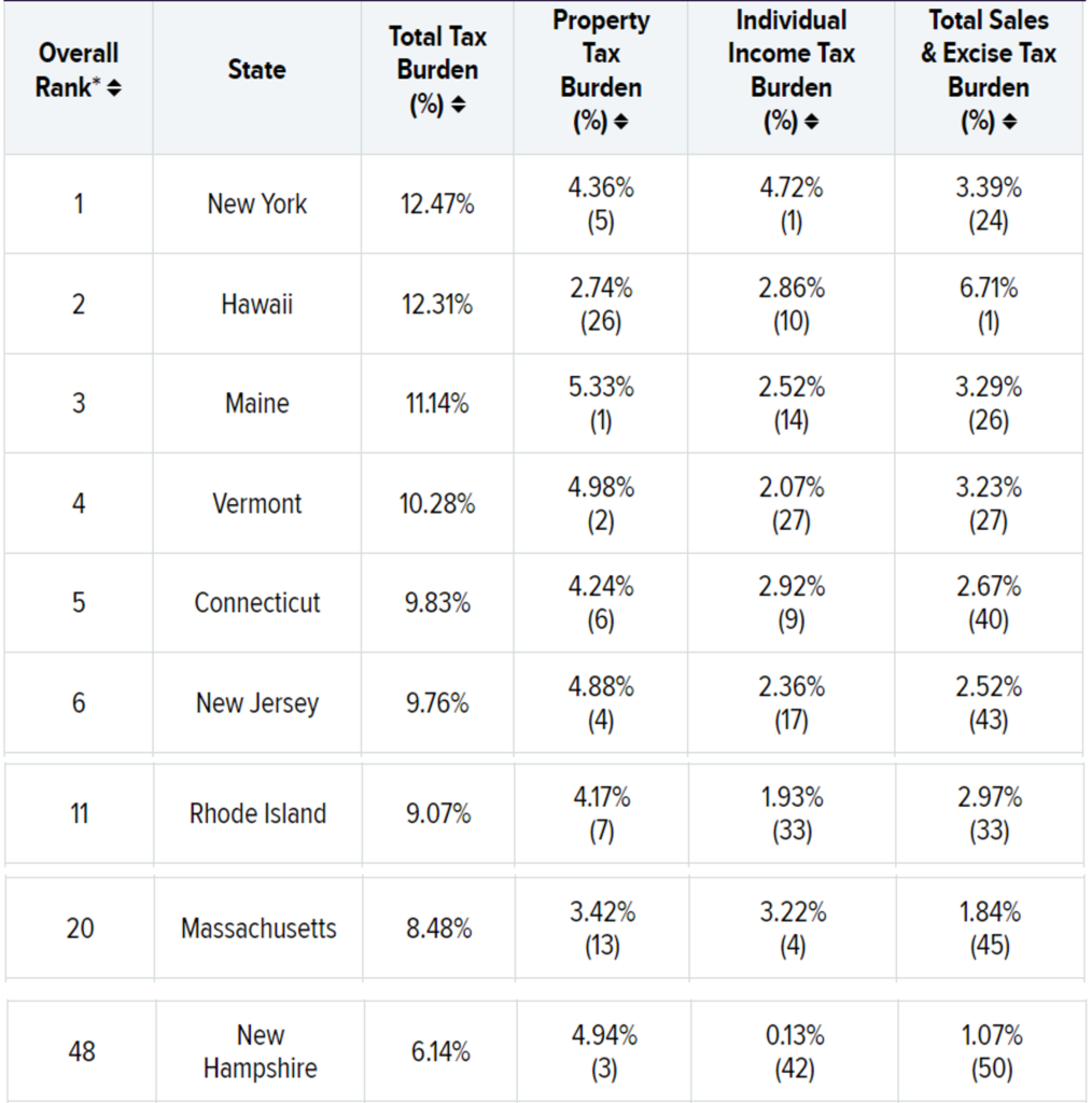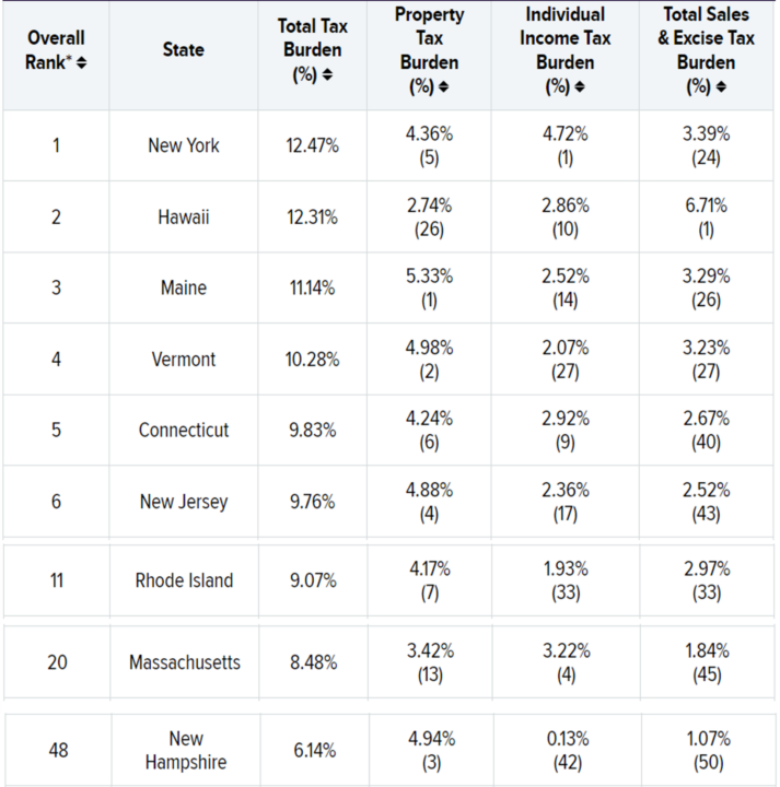 Regionally, New Hampshire has a lot of Demcorat-run neighbors, all of whom – regardless of the story they tell about the property or taxes, rank a bit higher for tax burden than the Granite State.