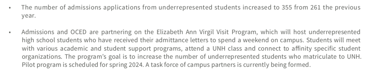 And if UNH is NOT considering race, sex, sexual orientation, etc., etc., etc., in admissions, then explain how UNH knows how many “underrepresented” students apply and how many attend. And also, explain to me how basing your admissions policy on increasing the number of “underrepresented” students is different from discriminating against “overrepresented” … i.e., white students.