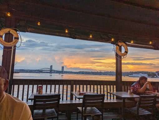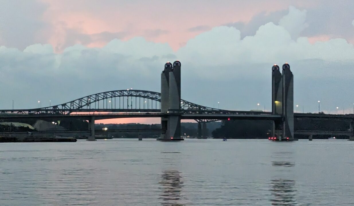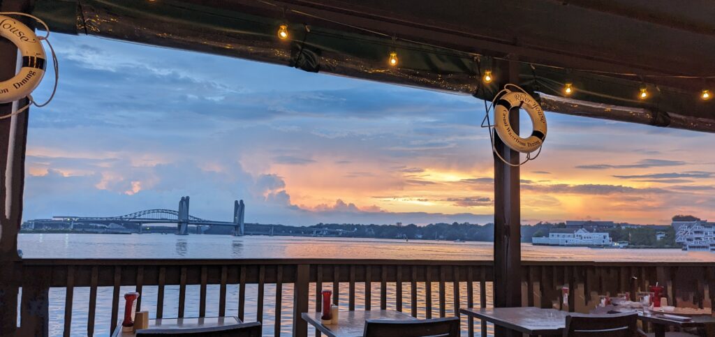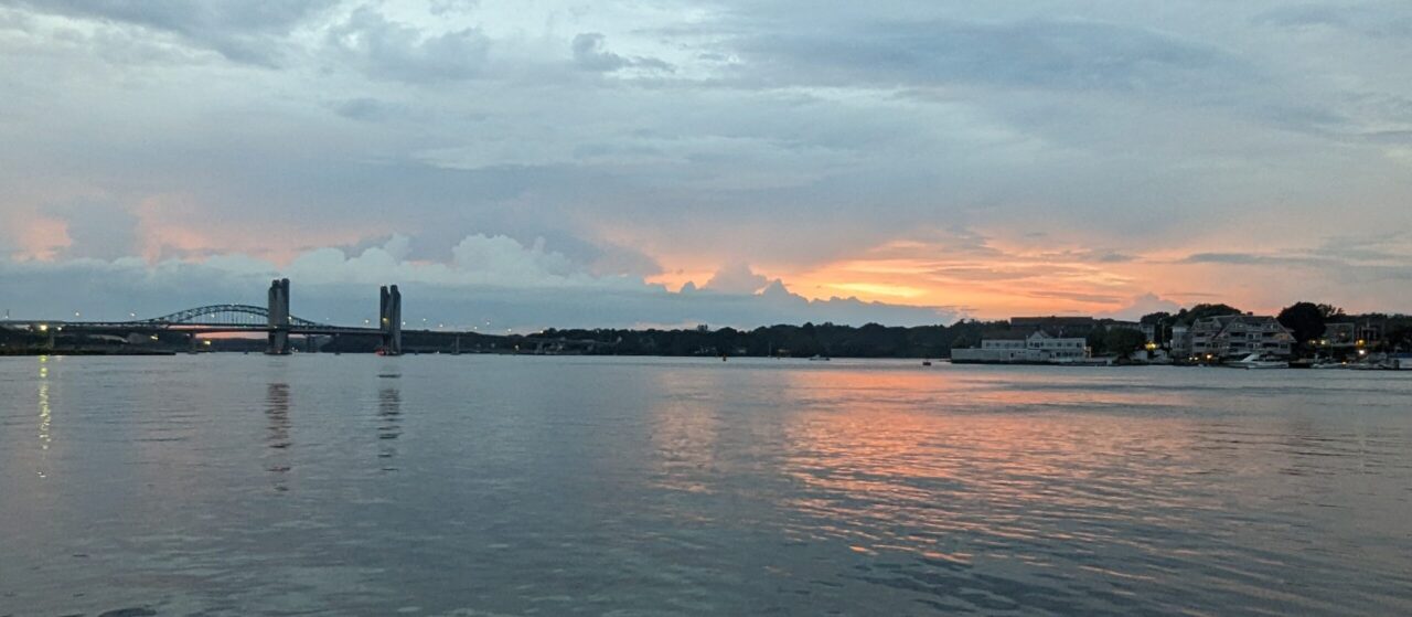 The storm clouds looked impressive, some “cool-looking” lightning off in the distance, but the seas were never rough, and it rained for all of ten minutes on the river. By the time 6 pm rolled around when the event was to start, there were even calmer waters, no rain, bleeding into a beautiful sunset (pics of that below as well).