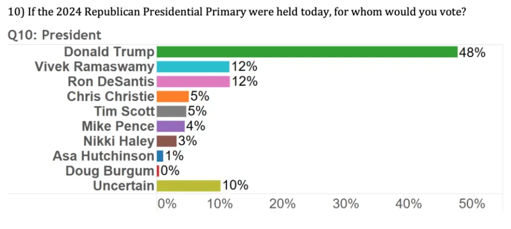 I don’t think so, not yet. The sample size is not huge (800 likely GOP primary voters), and no other poll has any result comparable to it. A July 20 Reuters Ipsos poll has Vivek at 9% (DeSantis at 19) while Quinnipiac has Desantis at 25 and Ramaswamy at 2. Ramaswamy lands fourth behind Pence in almost every other sample, with DeSantis second and Trump way ahead.