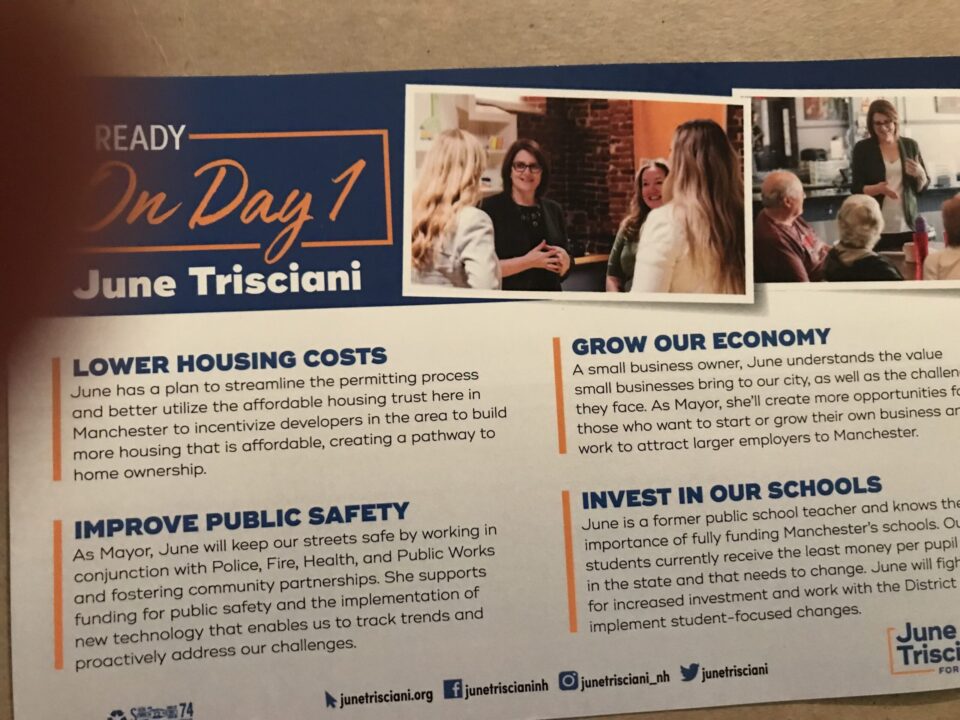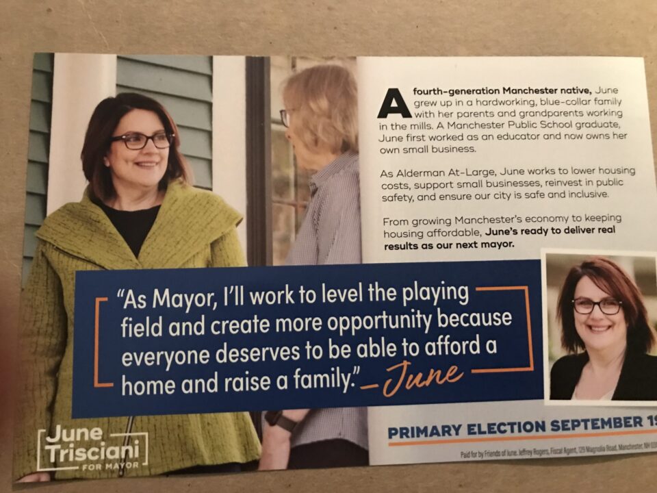 Instead … BE LIKE JUNE. No, not the month. The candidate. June Trisciani is running for Mayor of Manchester. June Trisciani is a COMMUNIST. But you would never know it from her campaign literature. Indeed, you would … if the only thing you knew about June is what you read on her literature … believe that she is a very reasonable, measured, middle-of-the-road, centrist, moderate … okay you get the idea.