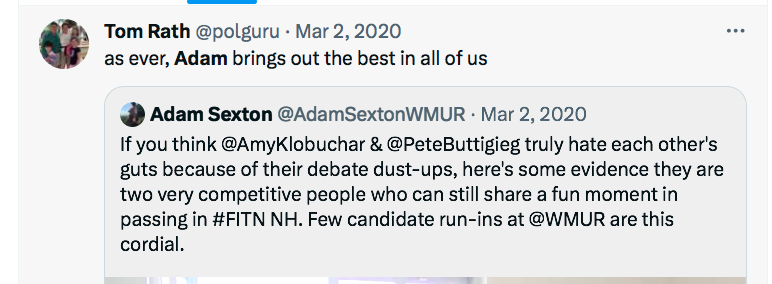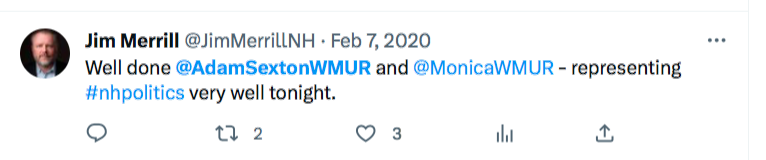 Any neutral, objective person would consider Adam Sexton a partisan hack. A wannabe, mini-me Jake Tapper. Recall, for example, how in 2017 he amplified the NH-Democrats’ smear that Trump voters are “White supremacists”: