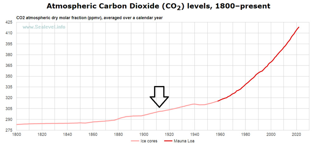 The warm Greenland Summer caused the icebergs to multiply into one of which the Titanic collided. It was 94 degrees in Western Greenland in the summer of 1911, so let’s hop into a different way back machine and look at where atmospheric CO2 was in 1911 – 1912, given that it is the foundation of the climate cult’s mythology.