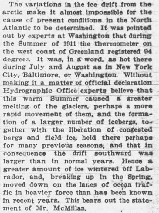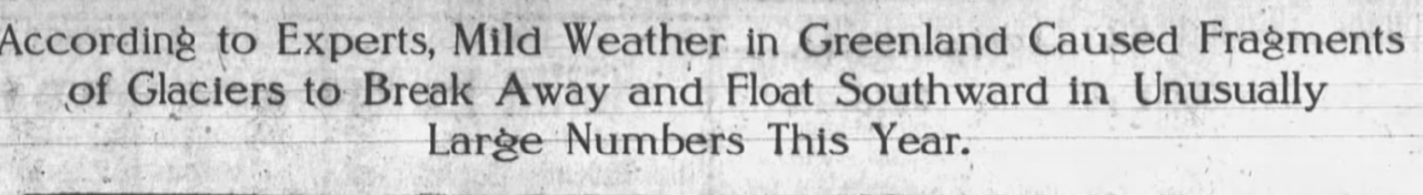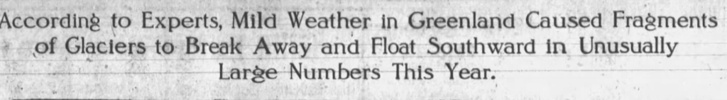 Tony Heller has a clip from The Morning Post, May 8, 1912, about the prevalence of icebergs in the Atlantic. I also have a subscription to Newspapers.com, so I followed his link to check it out. Here’s the headline and subheading.