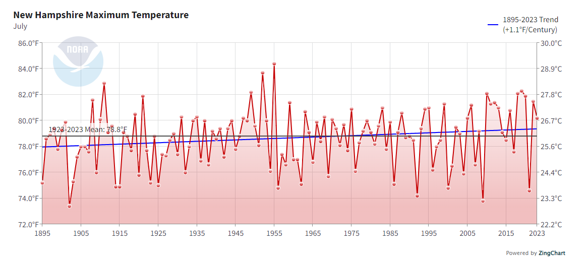 Maximum temps in the Granite State were less impressive. While above the 100-year mean of 78.8 – July 2023, 80.2 – 26 previous Julys had higher maximum temperature averages than 2023.