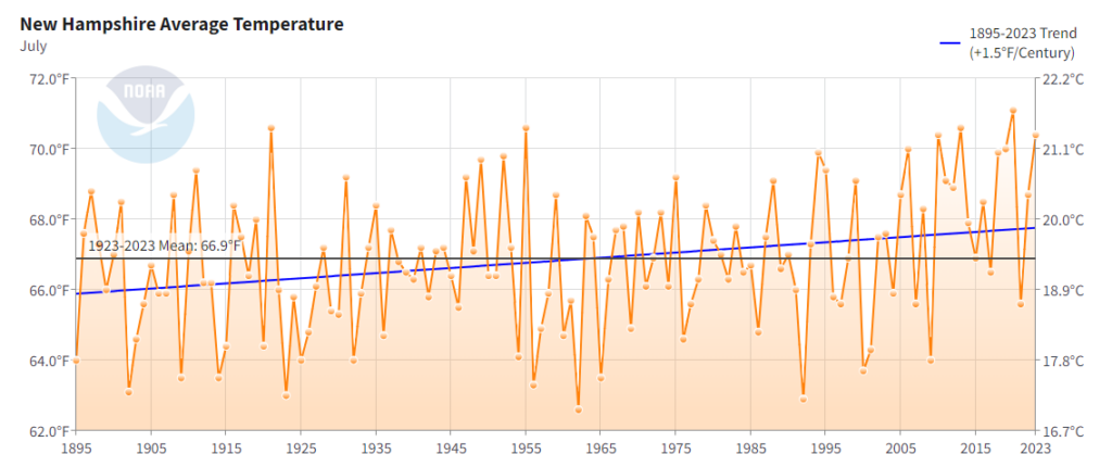 The other story that dominated the media was the heat. We were boiling in July. It was hot. Summer is like that sometimes. The hottest time of the year, actually. The 100-year average temperature for New Hampshire in July is 66.9 Deg F. July 2023 was 70.4 F. It was hotter in 1921, 1955, 2013, and 2020.
