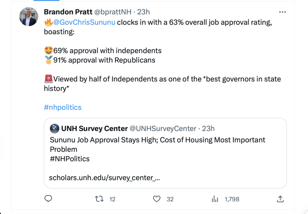 So I came across this. One of Sun-King Sununu’s minions boasting that His Majesty has a 91 percent approval rating among Republicans:
