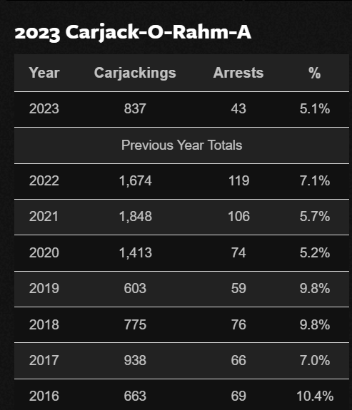 Is the carmaker also responsible for the decline in carjacking arrests, which dropped from nearly 10% of the criminals responsible to about 6%?