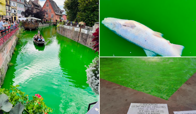 Éric Straumann, the mayor of Colmar, an Alsatian town whose waterside district is known as Little Venice, said dozens of dead fish were found floating on the surface after the protesters dumped drums of fluorescein in the River Lauch at the weekend.