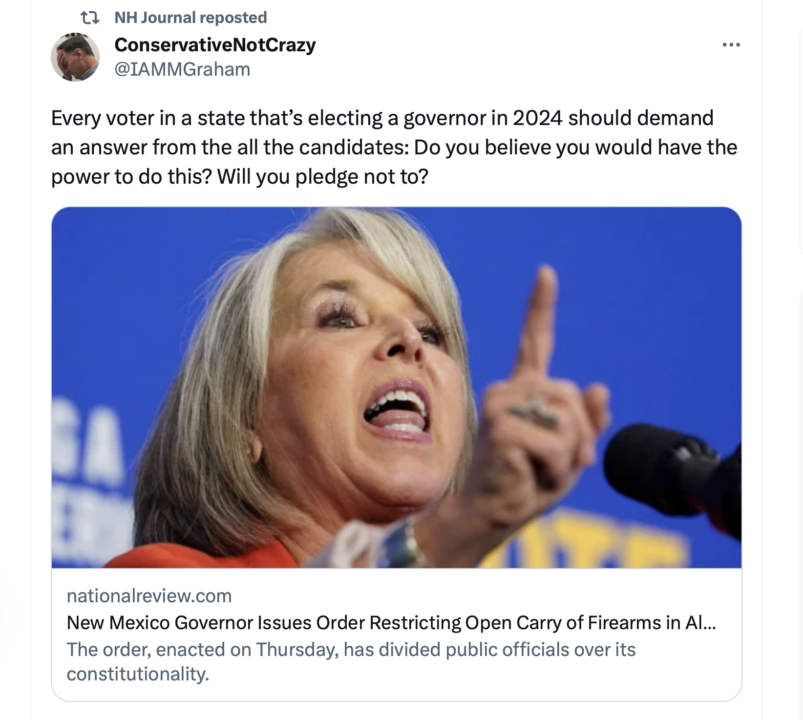 NeverTrump-fanatic Mikey Graham thinks the GOP can make political-hay out of New Mexico’s Governor’s suspension of the Second Amendment because of an “emergency” (see tweet below). Yet Mikey was one of the biggest cheerleaders for Sun-King Chris Sununu’s suspension of the New Hampshire constitution to fight the COVID “emergency,” which it is now undeniable was hardly an “emergency” … unless you want to go along with Debbie Birx’s creative bookkeeping where every death, no matter how obviously NOT from COVID, was nonetheless classified as a COVID death.