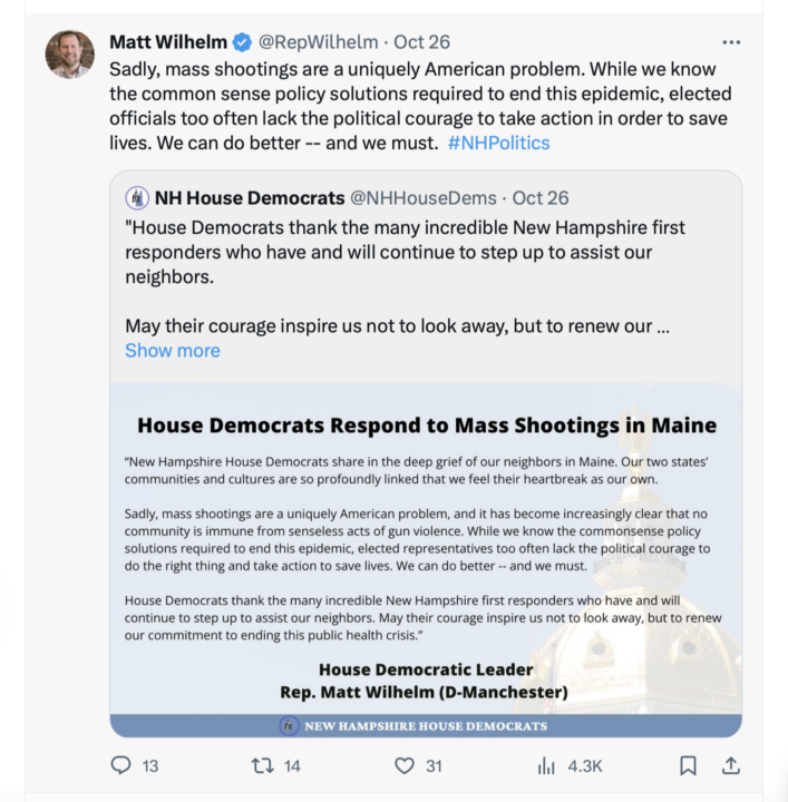 Nevertheless, here is the leader of the Democrats Communists in the New Hampshire House doing what Democrats Communists always do after a mass shooting … exploiting it to further their agenda of disarming law-abiding Americans. Matty Wilhelm and his ilk are despicable.