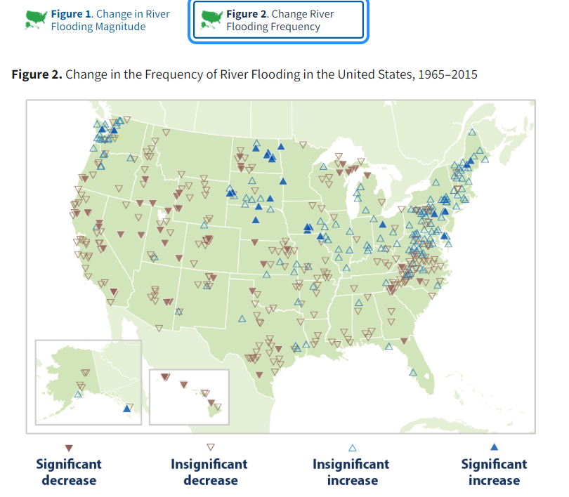 According to the EPA, flooding magnitude and frequency have both declined in the US since 1965. Increased flooding frequency has occurred at 186 locations and decreased frequency at 295 locations.
