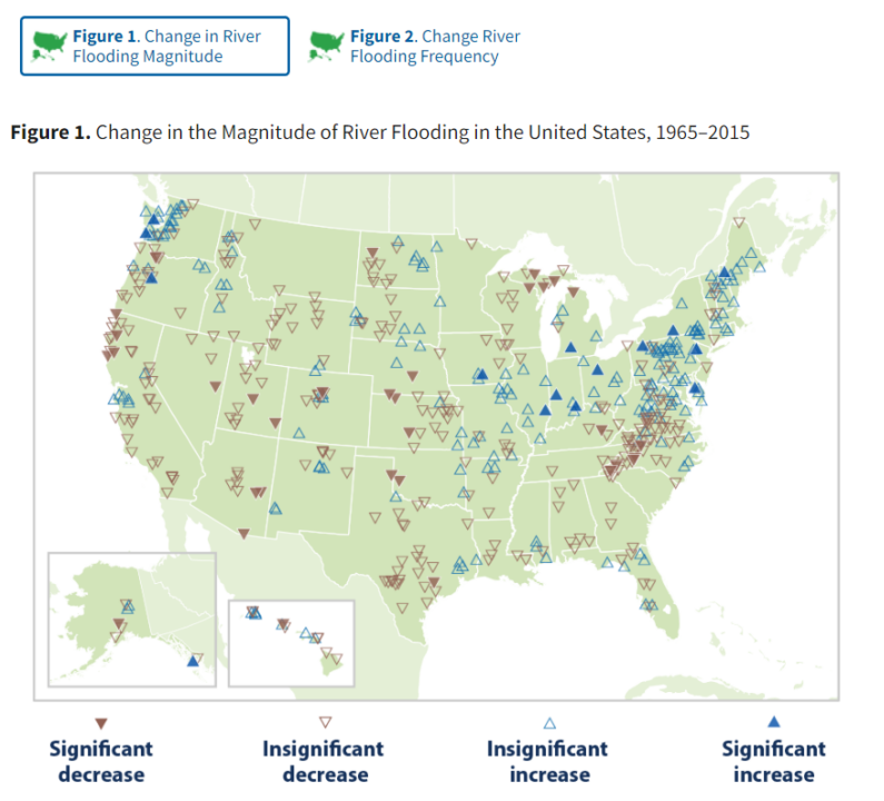 It appears that the flooding increases are mostly in urban areas, which is more an indicator of impervious build out over the land with inadequate water take away. Is it possible that government engineers failed to recognize the difference between the percolation of soil versus asphalt?
