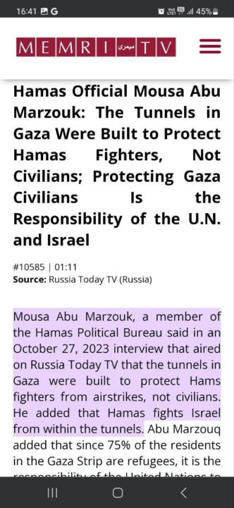 In reference to the above excerpt’s statement about diverting resources, here’s a senior Hamas official talking about their use of tunnels to attack: