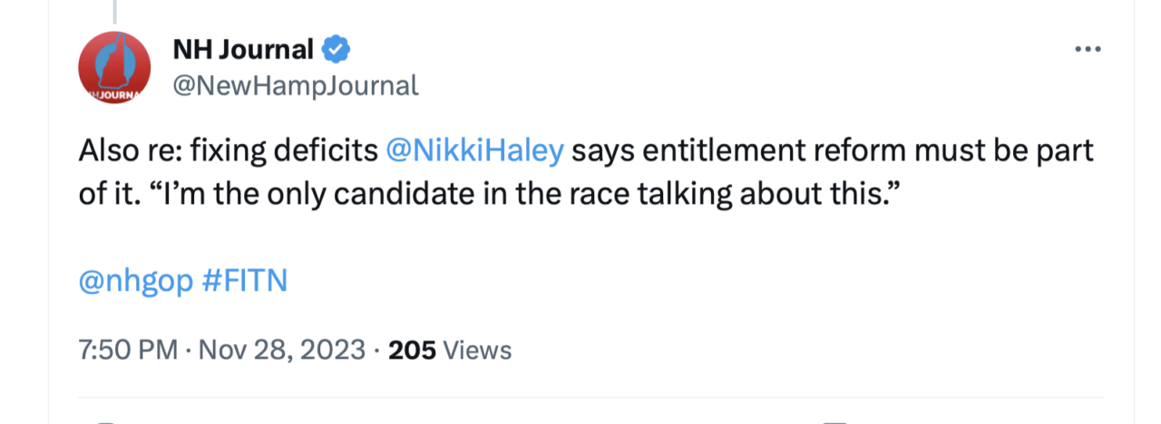 Nikki is also taking a page out of the GOP’s failed playbook by talking about “entitlement reform” … which everyone knows is code for cutting future social security benefits: