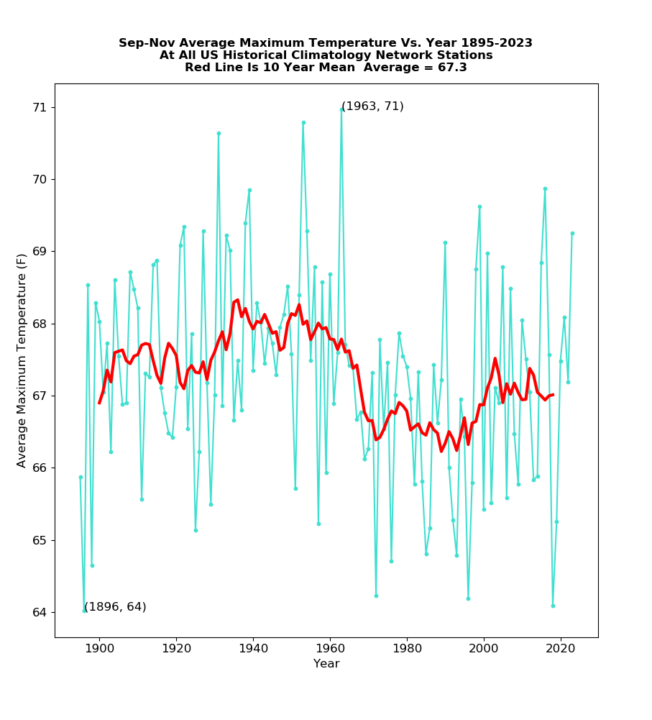 If you find yourself confronted with a headline, comment, or climate cultist claiming that the fall of 2023 was the warmest autumn on record, well – we are here to help. Not only was it not, and you knew that was coming, but there were 11 years since 1895 with equal or hotter autumn temperatures.