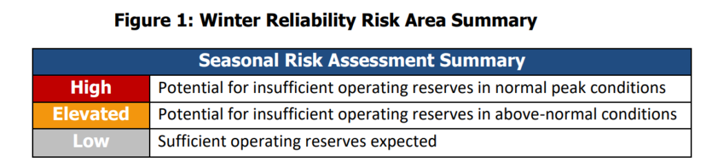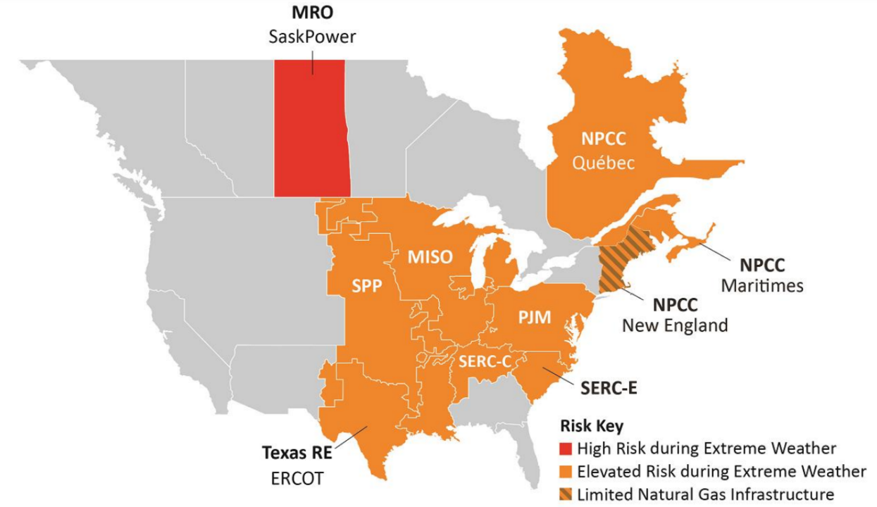 • NPCC-New England: The capacity of natural gas transportation infrastructure could be constrained when cold temperatures cause peak demand for both electricity generation and consumer space-heating needs. Potential constraints on the fuel delivery systems and the limited inventory of liquid fuels may exacerbate the risks for fuel-based generator outages and output reductions that result in energy emergencies during extreme weather.