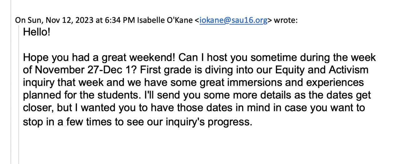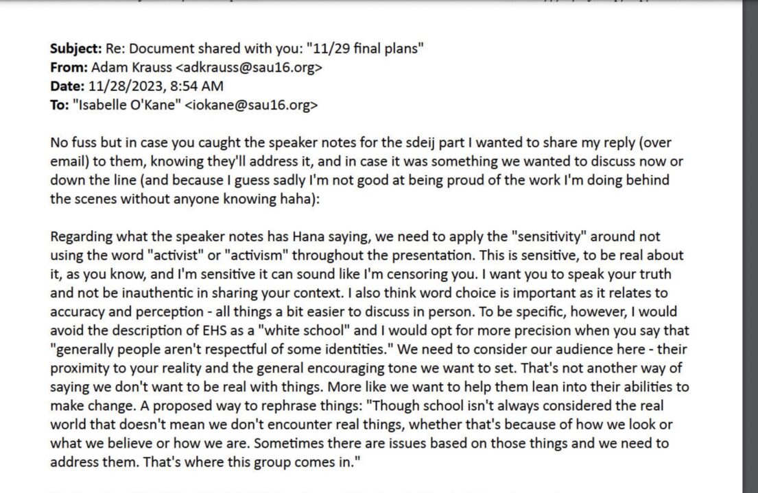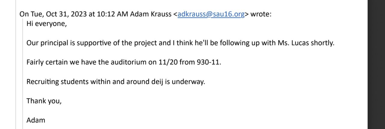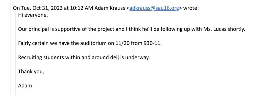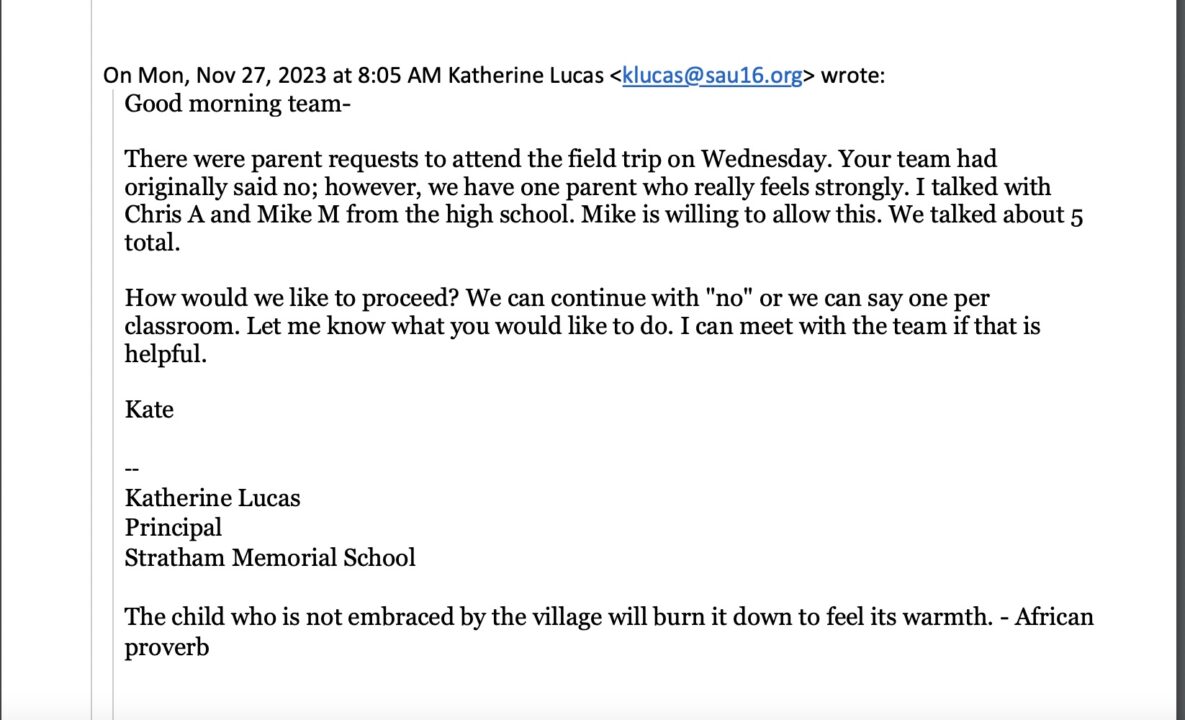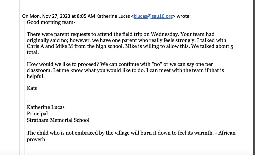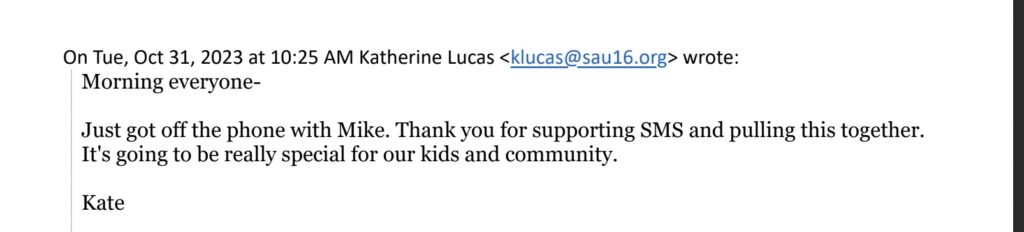 You can see from the emails below that I obtained from the district that a quality education for children in SAU16 is not their goal. But until more parents demand better from the people they employ in their district, they are only denying their children a quality education that opens a world of options. Just think if they spent their time focused on making sure the students were proficient in math, reading, science, and all of the core academic subjects!!