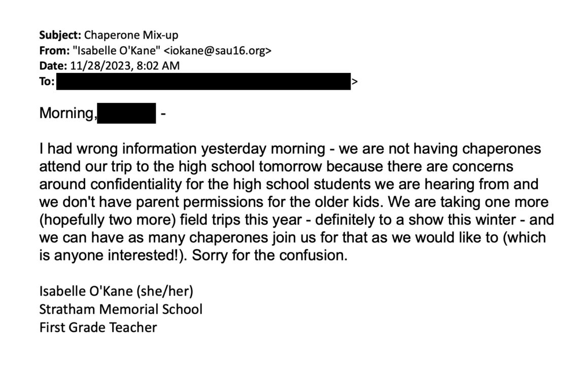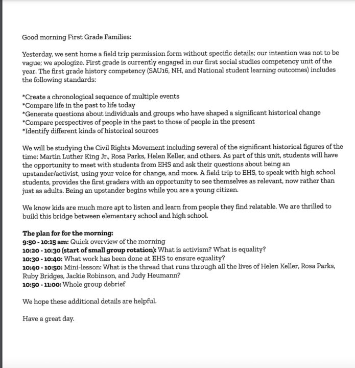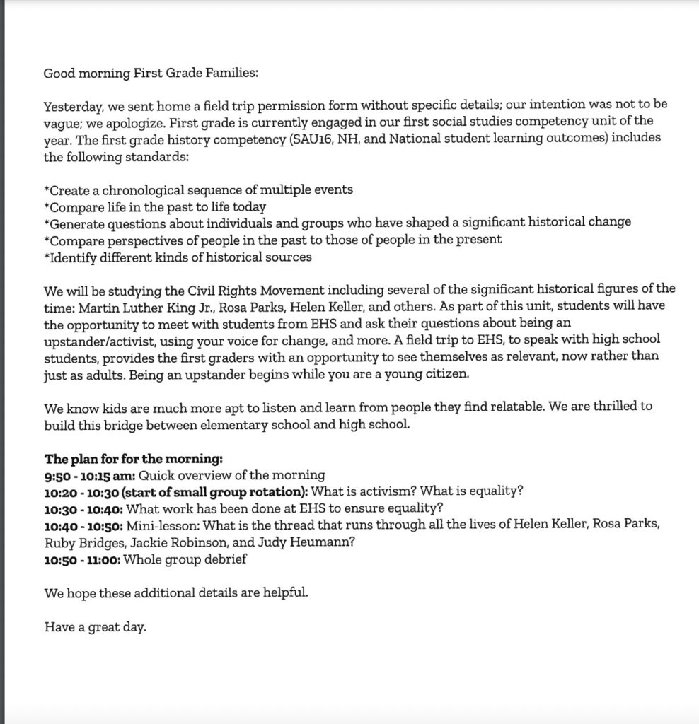 A few weeks ago parents in Stratham received a permission slip so that their 1st grade children could attend a field trip at the high school. The field trip indicated that the purpose was to learn about political activism.