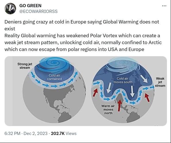 If you recall, the wonky jetstream is your fault, except it’s not. Without relitigating it, grand solar minimum decreased solar energy and weakened jet stream equals wonkiness. The science and journalism, or do I have that backward, argues that you’ve gone and done it—you and your gas-powered leaf blowers and string trimmers and combustion engines and white privilege. You broke the planet, you murderer!