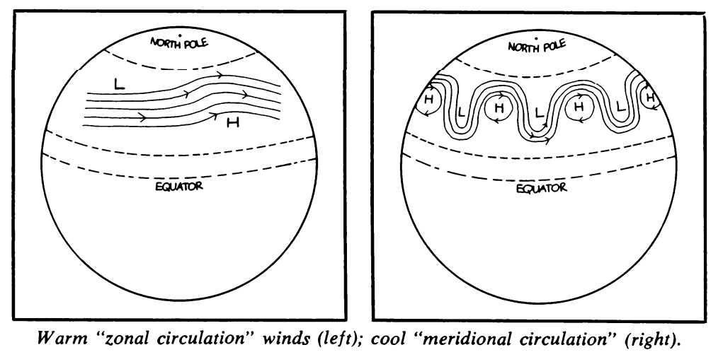The cause of this increased variability can best be seen by examining upper atmosphere wind patterns that accompany cooler climate. During warm periods a “zonal circulation” predominates in which the prevailing westerly winds of the temperate zones are swept over long distances by a few powerful high and low pressure centers. The result is a more evenly distributed pattern of weather, varying relatively little from month to month or season to season.