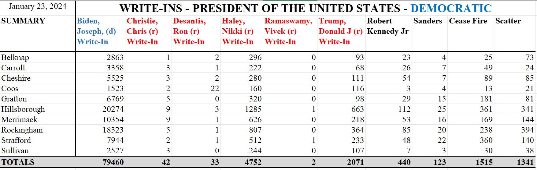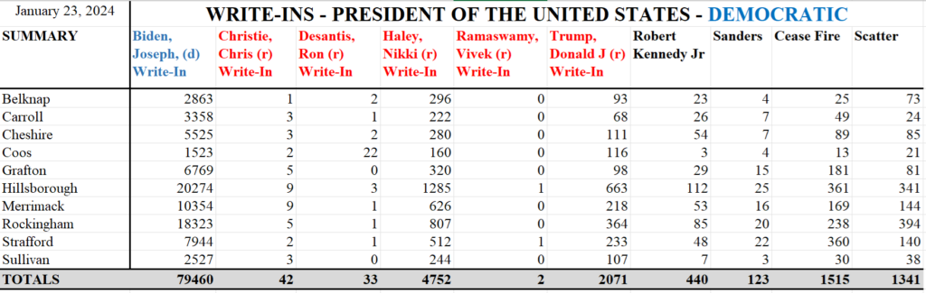 4,752 wrote in Nikki Haley, 2,071 for Donald Trump, 40 for Christie, 33 for Ron DeSantis, 2 for Vivek, 440 for RFK Jr., and 123 for Bernie. Cease Fire was an Andru Volinsky Gaza thing, and the scatter is illegible or otherwise uncountable marks. Much of that will be the undeclared pulling a blue ballot, but we’ve likely got our share of conscientious objectors.
