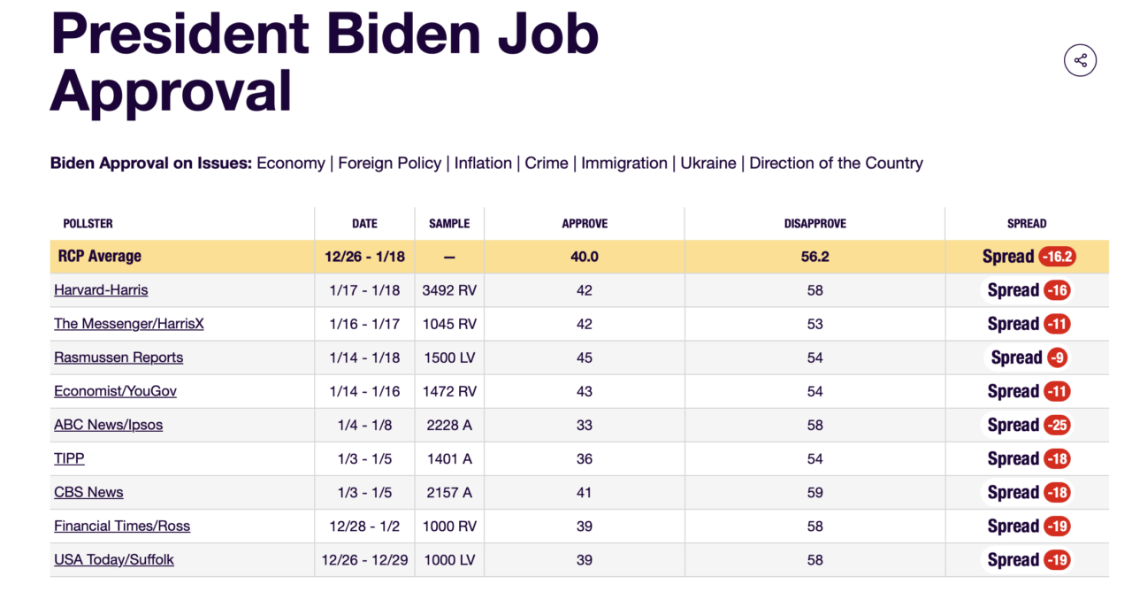 Today’s (1/20) Real Clear Politics Average has Biden’s job approval at 40 percent. Stated differently and arguably more accurately, 40 percent of Americans hate America. The Biden Regime is, in reality, Obama’s third term, and the people really running the Biden Regime are hell-bent on completing Obama’s goal of “transforming” America into a socialist-based-on-woke, apartheid dystopia.