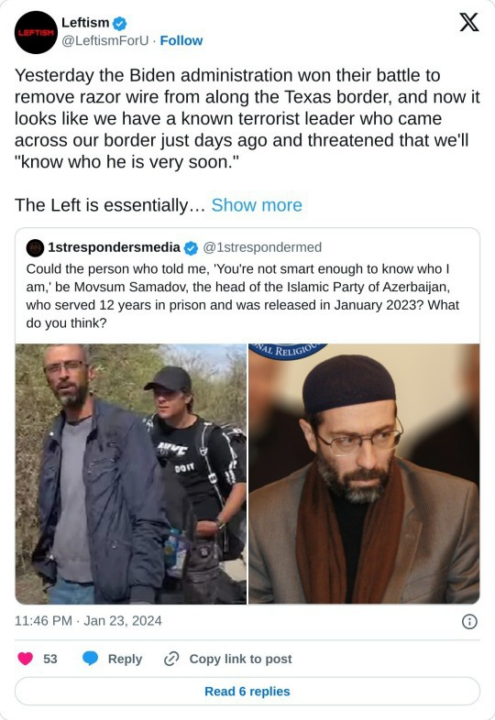 Sure does look like him. And this is who is coming in through our border. We doubtless have multiple cells here – Islamic, Chinese, Iranian, Russian… I predict things will get very spicy, within the year, and focused on the cities where the most damage can be done.