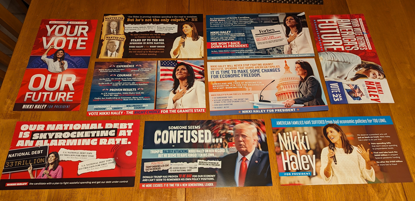 Today, in my mailbox were 13 items. Ten of these were political flyers. They all had Nikki Haley’s name on them, but contrary to her ads, none were from Trump. Only one was negative. The other nine were pro-Haley. SFA Fund Inc. paid for seven of them. AFP was responsible for the other two. The Anti-Nikki flyer was from Never Back Down.