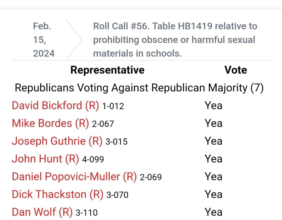 Republican Bill Boyd reportedly introduced a floor amendment to gut it. That amendment died a glorious death 358 – 17. Rep. Cordelli (Actual Republican)then used the opportunity that followed for debate to read graphic excerpts from a book found in NH Middle School.