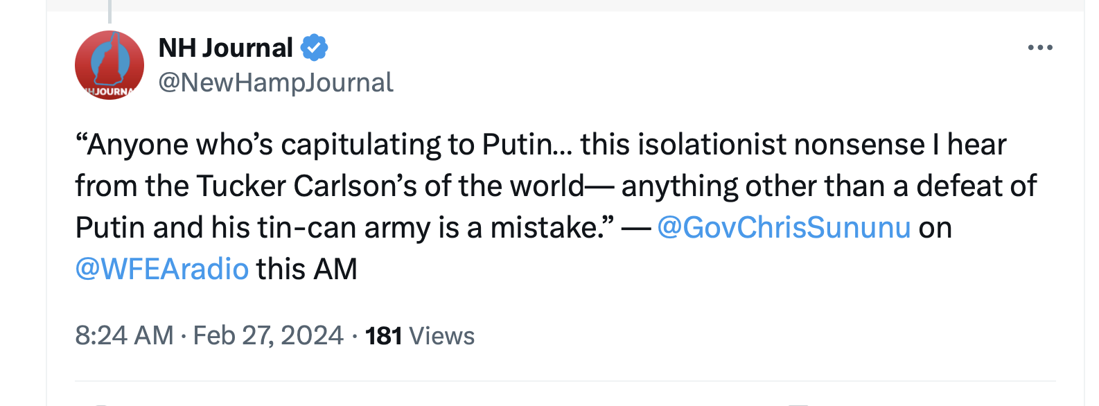 And the timing couldn’t be better for New Hampshire’s mighty Sun-King, Chris Sununu. The Sun-King has had it … HAD IT … with “isolationists” like Tucker Carlson. Ukriane’s fight is our fight! Ukraine’s border is our border! Salva Ukraine! Salva Ukraine! Salva Ukraine: