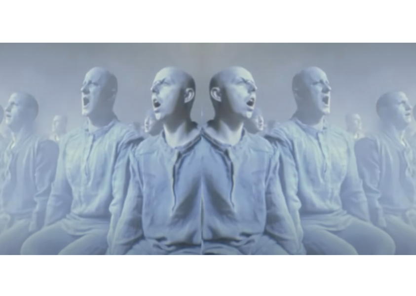 Cut back to the original view. The screens are blank and quiet. The people are looking around in a daze as if just awakened from a dream.