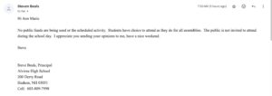 After receiving numerous messages from parents, I decided to contact the Principal of Alvirne High School to question this decision, and request that parents and members of the public also be able to attend. Here is the email I sent to the Principal: