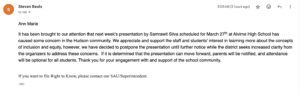 After this became public, parents and residents began sending emails to request that they attend this presentation. Some parents requested that they cancel the presentation, due to the political bias they believed would be presented. Parents could see that there was no alternative viewpoint that would accompany this message.
