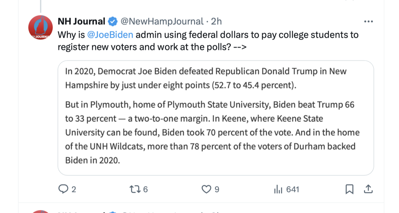 The right question is why … DESPITE EIGHT YEARS of off-and on GOP control of State government under the reign of the mighty Sun-King Chris Sununu … New Hampshire STILL ALLOWS OUT-OF-STATE COLLEGE STUDENTS to decide its elections. And do NOT tell me it’s because the Constitution requires it … other States do NOT allow out-of-State college students to vote in their elections and New Hampshire could do the same.