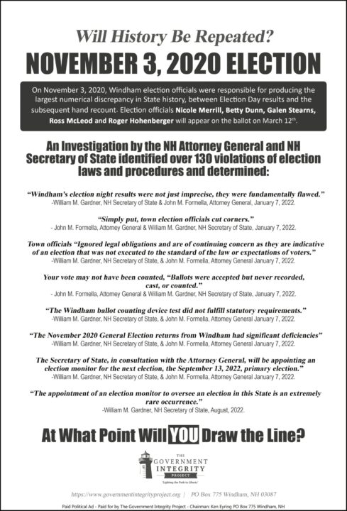 The inability of Windham’s election officials to follow election laws during the November 3, 2020 election led to the dubious distinction of having an election monitor appointed for the September 13, 2022 primary. According to Secretary of State William Gardner, “the appointment of an election monitor to oversee an election in this state is an extremely rare occurrence.”