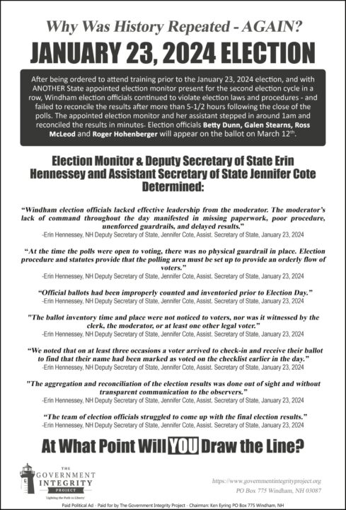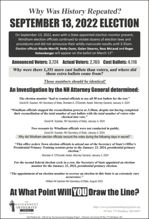 The Government Integrity Project (www.gipamerica.org) put together three full page ads (here, here and here) and a direct mailer to inform Windham voters of the recurring failures of Windham’s election officials as identified in the multiple reports mentioned above. Election officials and their friends falsely call them lies and a smear campaign. Honest people know it’s the truth.