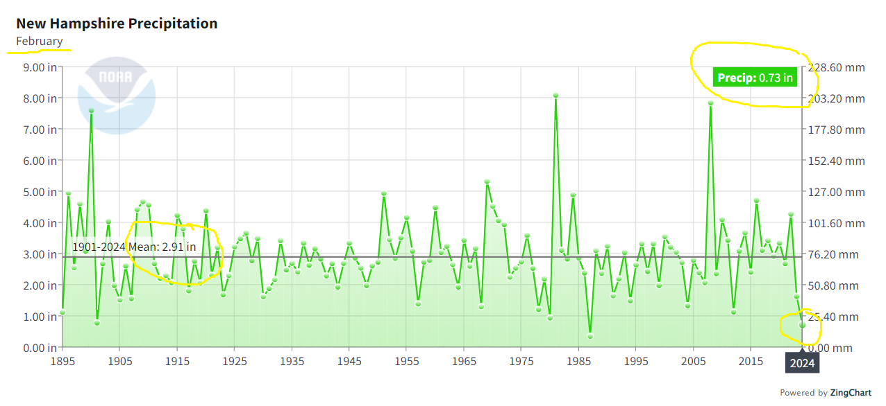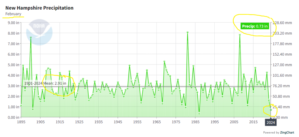 Post-Ice Age warming has resulted in a generous increase in available water for Granite Staters, at least on the averages, but the reporting is a bit less measured. We’re either drowning or droughting because clicks are more important than facts. And given the facts, as present by NOAA of all places, issues with water management seem more likely the culprit than the absence or presence of rainfall in any given month.