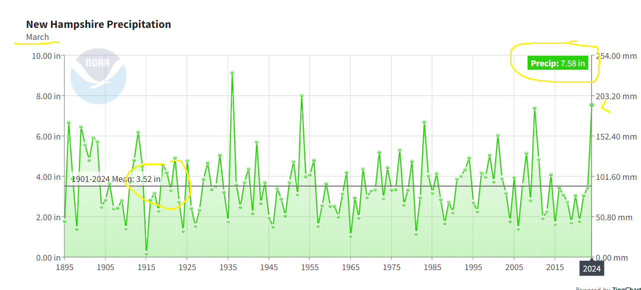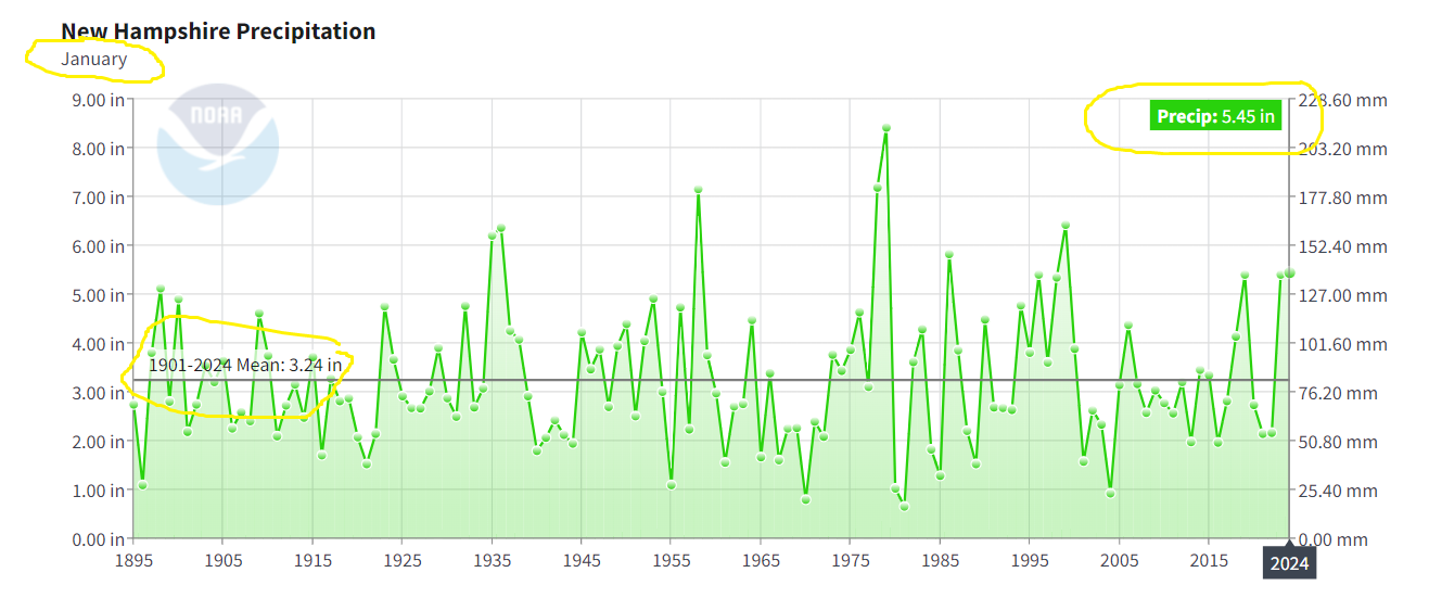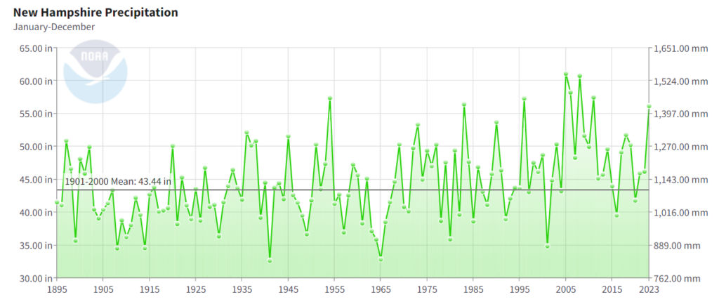 I can’t speak for everyone, but New Hampshire has been in a decades-long wet period that you can clearly identify by the years of corporate media drought reporting. How much more? The 100-year mean from 1901 to 1999 is 43.44 inches annually. The mean for the past 50 years (1973-2023) is 47.35 inches annually. Since 2000, the annual mean is 48.97 inches.