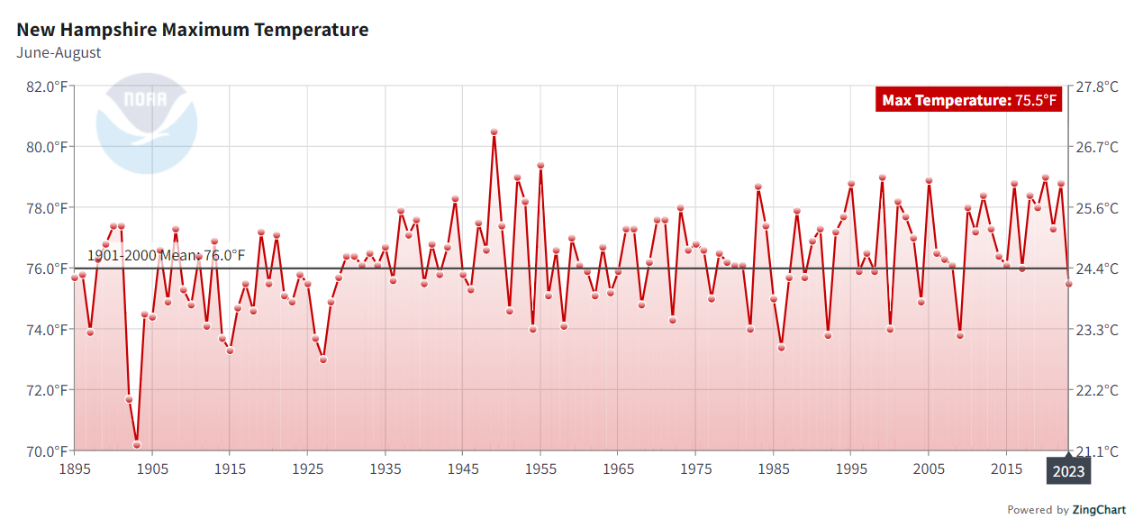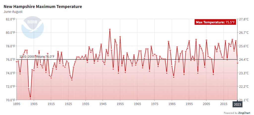 But last summer (Jun-Aug 2023), New Hampshire’s maximum temperature was one-half of one degree below the 20th-century mean.