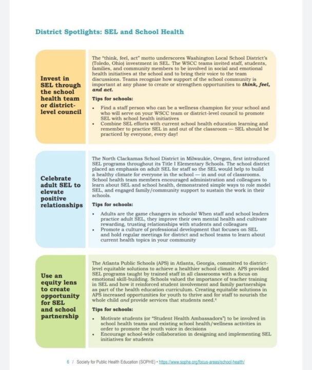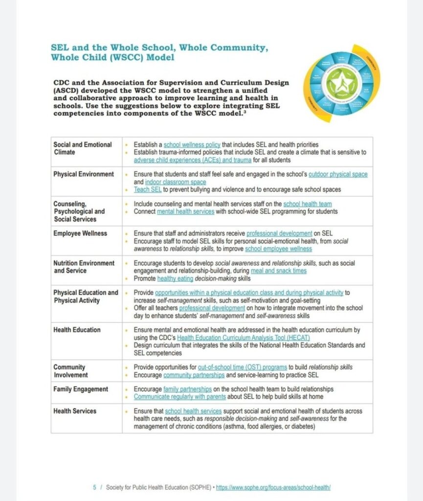 Social-emotional learning is designed to be combined with health and leads to the CDC Association for Supervision & Curriculum Design’s (ASCD) Whole School, Whole Community, Whole Child (WSCC) Community Healthy Schools model.