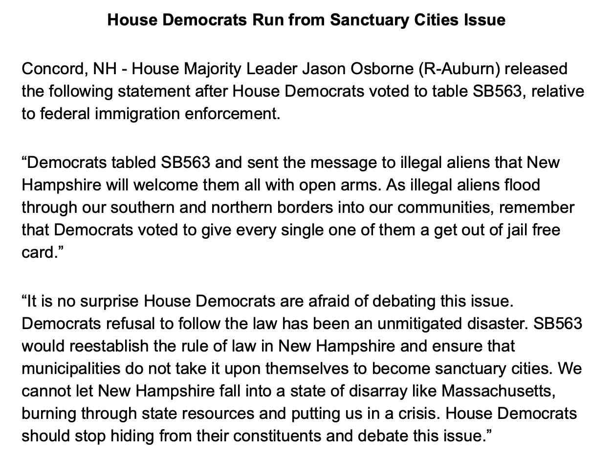 File it under, you-have-no-shame or you-can’t-make-this-stuff-up … NHGOP “Leader” Jason Osborne then issued a statement blaming the DemocratsWoke-Communists for the bill’s failure.