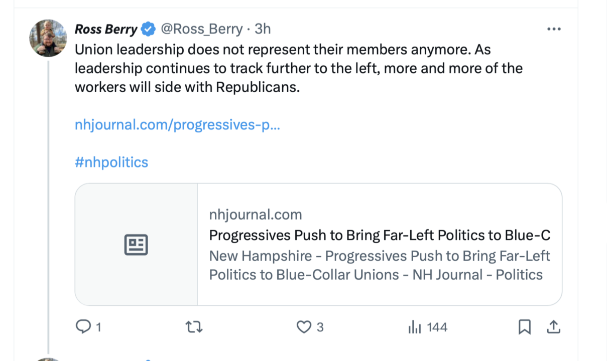 Here is a good one: Ross Berry criticizes union leadership on X for not representing union workers. The irony apparently escapes Berry. Berry and his fellow Republican “leaders,” Jason Osborne, Joe Sweeney, etc., do NOT represent Republicans.