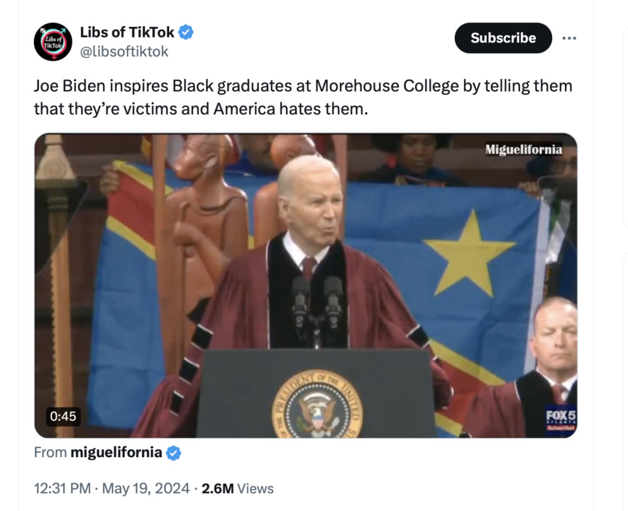 What a speech America’s imposter/figurehead President #DirtyJoeBiden gave at the Morehouse College commencement. Essentially … YOU JUST WASTED FOUR YEARS; YOUR DIPLOMA IS WORTHLESS; NO MATTER HOW MUCH YOU LEARN, HOW HARD YOU WORK, IT DOESN’T MATTER BECAUSE AMERICA IS INCURABLY AND PERVASIVELY AND FOREVER RACIST.