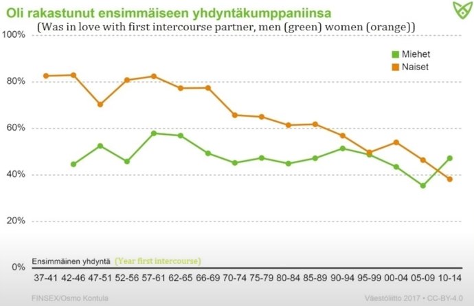 I misplaced the text that goes with this, but basically it’s a chart of what percent of males & females loved their first intimate partner (not sure what language that is). Not only is it disturbing that the trend goes down… to the point where half the people are giving themselves physically to people they don’t love or that, at least in this latest data point instance, more women than men now don’t love their first partner, there are other implications: