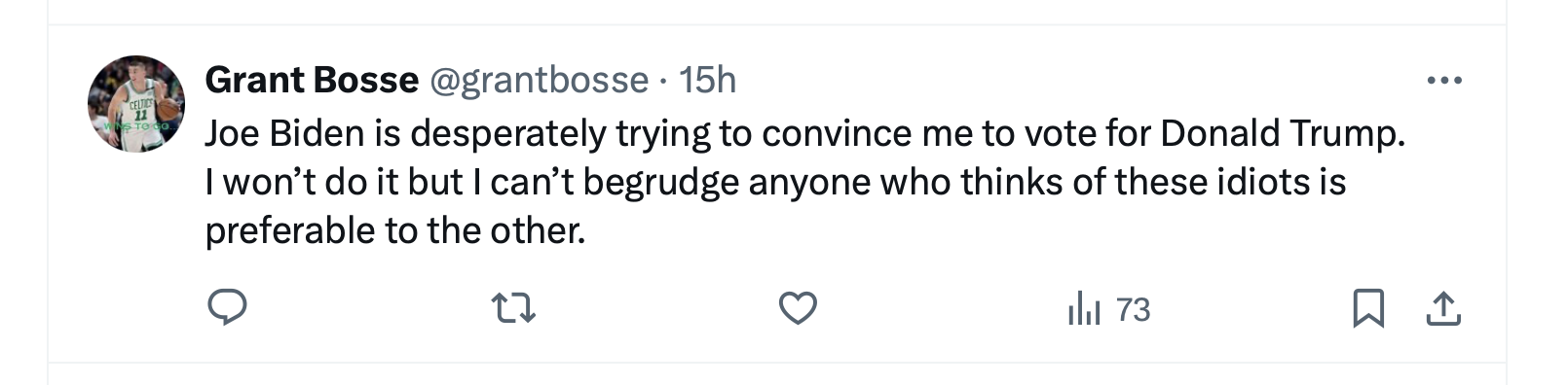 Grant Bosse … Deputy Chief of Staff for the N.H. Senate. And an incorrigible NeverTrumper (see screenshot below). Bosse has been a NHGOP insider for as long as I can remember. Just from memory: He ran and lost the GOP primary for CD-2 in 2008, and the NHGOP-powers-that-be placed him at Josiah Bartlett. Subsequently, he worked for Stinky-Joe McQuaid at the Union Misleader. At some point later, the NHGOP-powers-that-be placed him at the NH-DOE, presumably to keep Edelblut under control. When the GOP regained the State Senate majority in 2020, Bosse was handed a gig there as “Policy Director.”