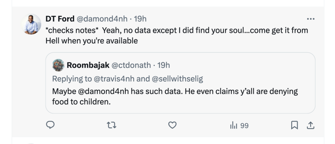 Asking DT Ford, or any Woke-Communist, to back up their claims that children in families earning 350 percent of the federal poverty level are going hungry … and that proves you are diabolical.